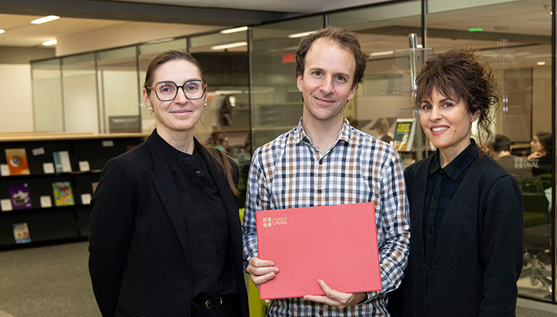 Dominique Lapierre, directrice des services-conseils de la Bibliothèque, Martin Lebrun, artiste-médiateur, et Audrey Bélanger, professeure adjointe à la Faculté des sciences de l'éducation.